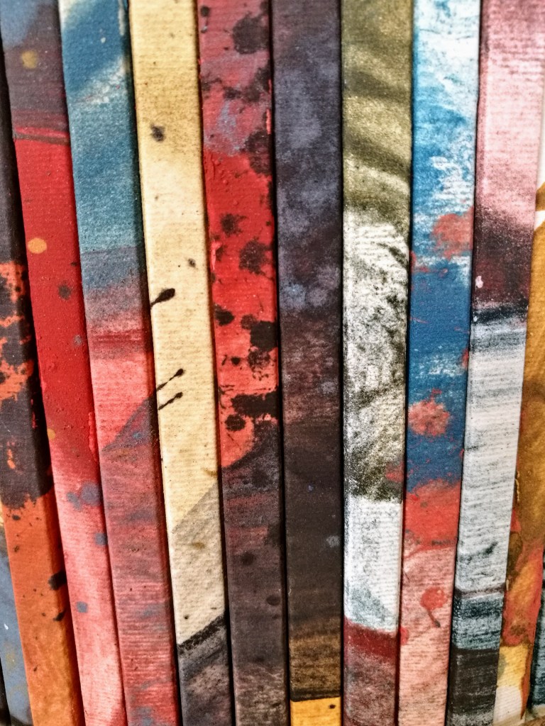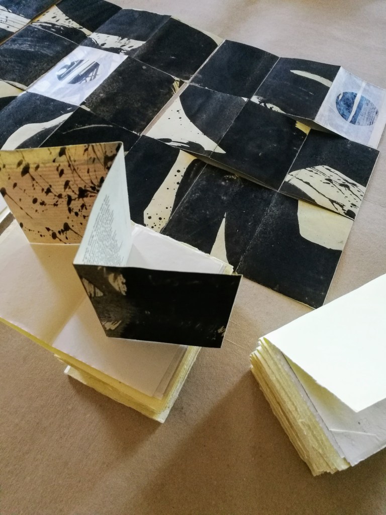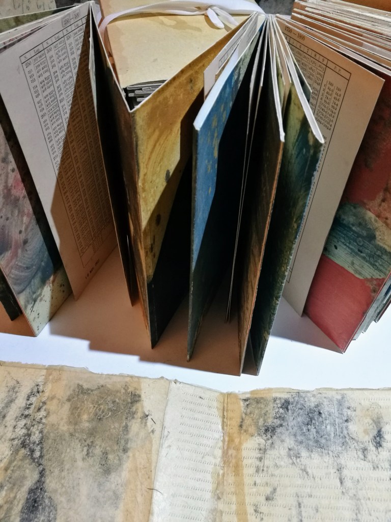 Ces livres/peintures, sous forme de Leporello, sont le manifeste d’une volonté d’abolir les frontières imposé par un confinement. La force de l’imaginaire et l’acte de peindre permettent de réaliser son endodrome ou le voyage intérieur. D’un confinement, d’un espace restreint, se créer son propre espace sans limite, des kilomètres de territoires…