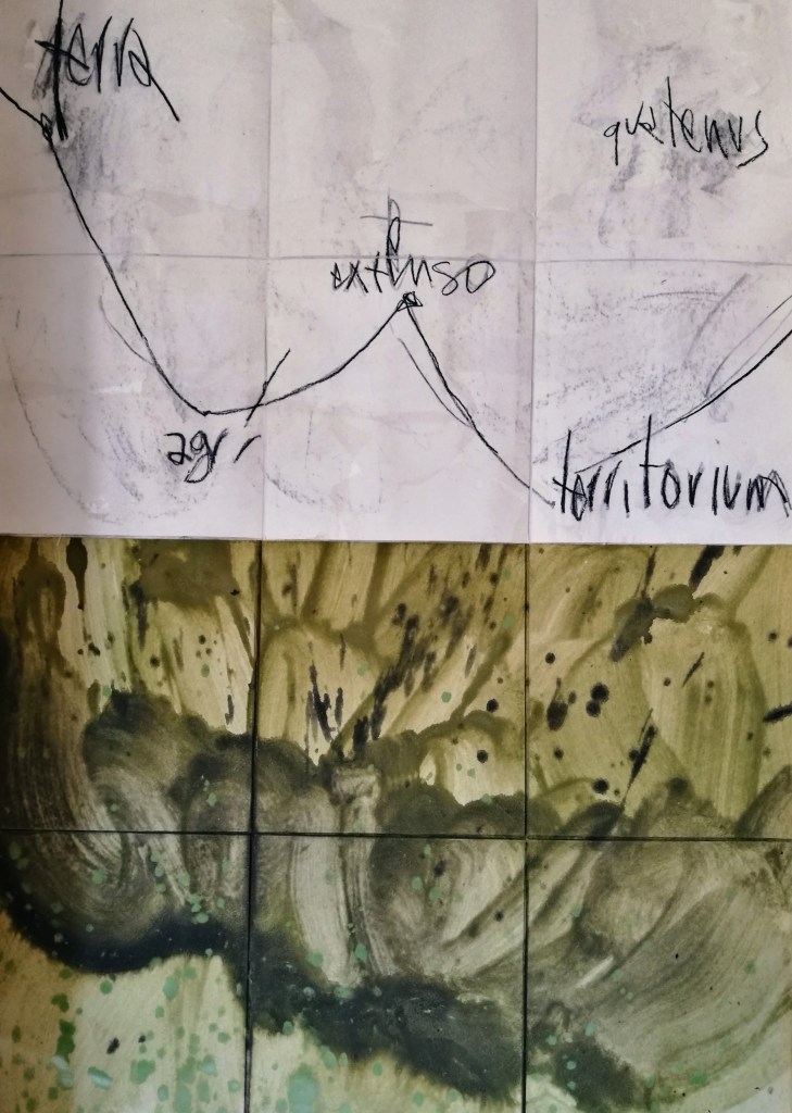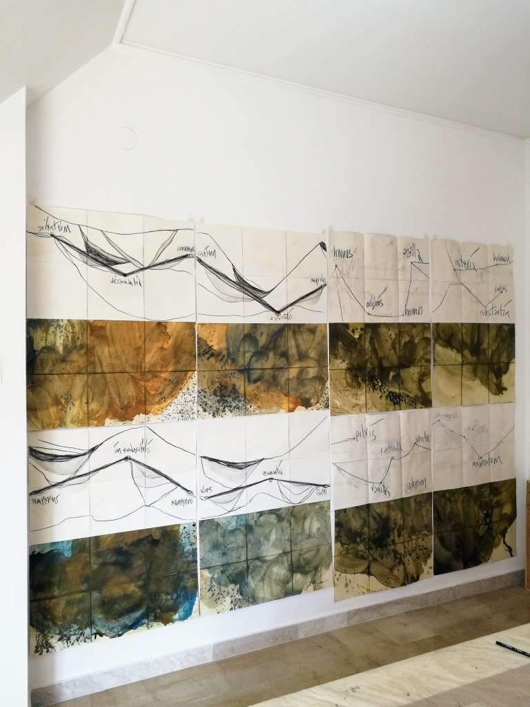 Atlas, carte mentale, Ghyom. Atelier. 2023.Atlas, carte mentale. Ghyom. Détail, pigment, mine de plomb sur papier Rives. 2023.Atlas, carte mentale. Ghyom. Détail, pigment, mine de plomb sur papier Rives. 2023.Atlas, carte mentale. Ghyom. Détail, pigment, mine de plomb sur papier Rives. 2023.Atlas, carte mentale. Ghyom. Détail, pigment, liant et glacis sur papier Rives. 2023.Atlas, carte mentale. Ghyom. Détail, mine de plomb et glacis sur papier Rives. 2023.Carnet de notes. Proxémie et définition des mots. 2023.