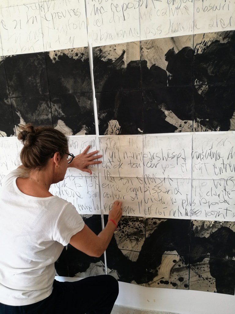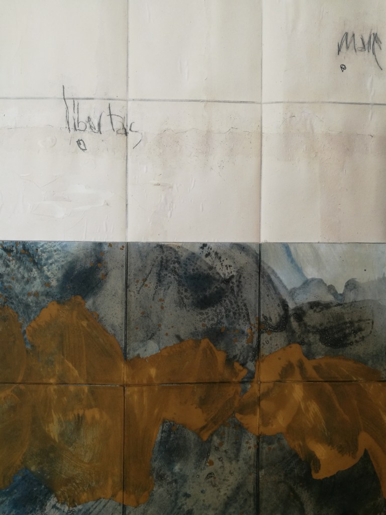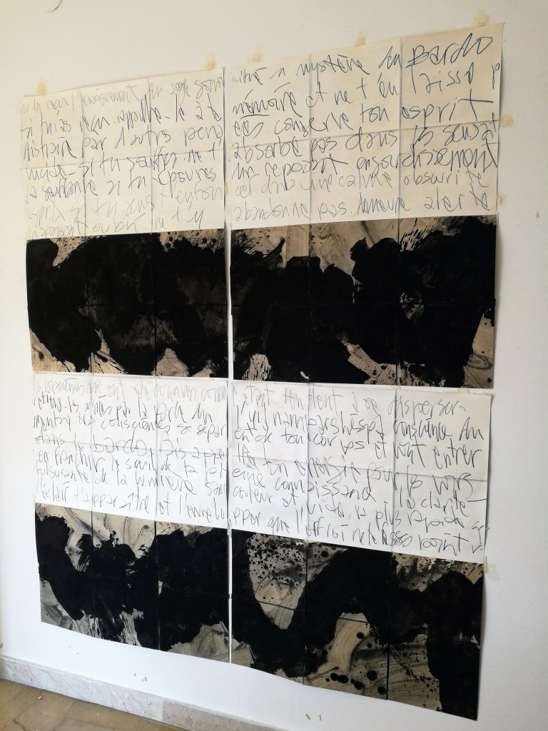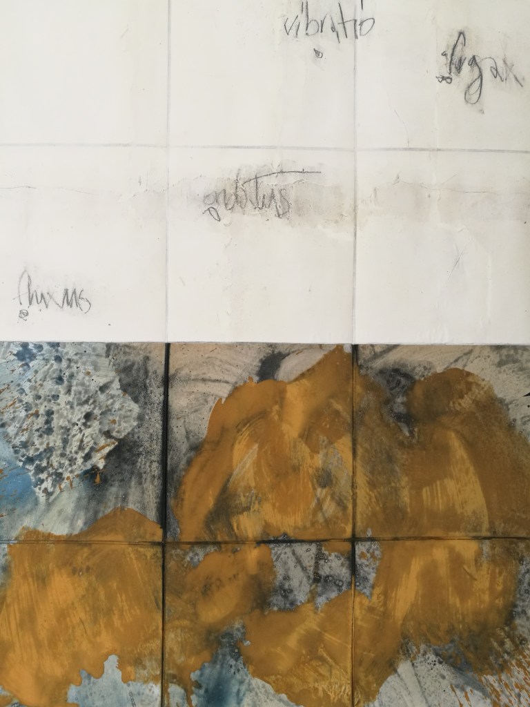 Atelier. 2024.Bardo. Intervalle. Atlas, carte mentale. polyptyque de 6 peintures, 210x200cm. Bardo. Intervalle. Détail, pigment, mine de plomb et glacis sur papier Rives. 2024.Bardo. Intervalle. Détail, pigment, mine de plomb et glacis sur papier Rives. 2024.Bardo. Intervalle. Détail, pigment, mine de plomb et glacis sur papier Rives. 2024.Bardo. Intervalle. Détail, pigment, mine de plomb et glacis sur papier Rives. 2024.Bardo. Intervalle. Détail, pigment, glacis sur papier Rives. 2024.Bardo. Intervalle. Détail, mine de plomb et glacis sur papier Rives. 2024.Carnet de notes. Proxémie et définition des mots. 2024