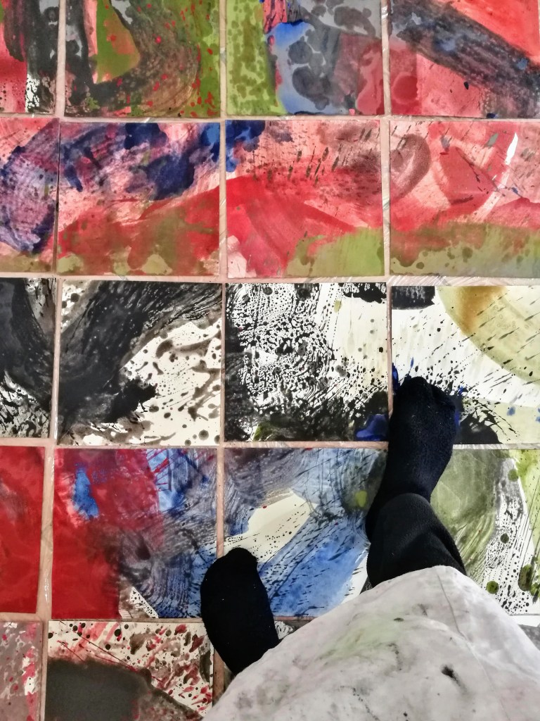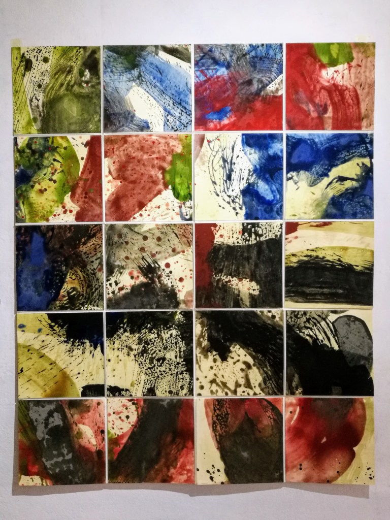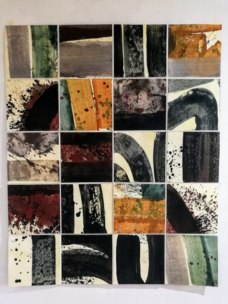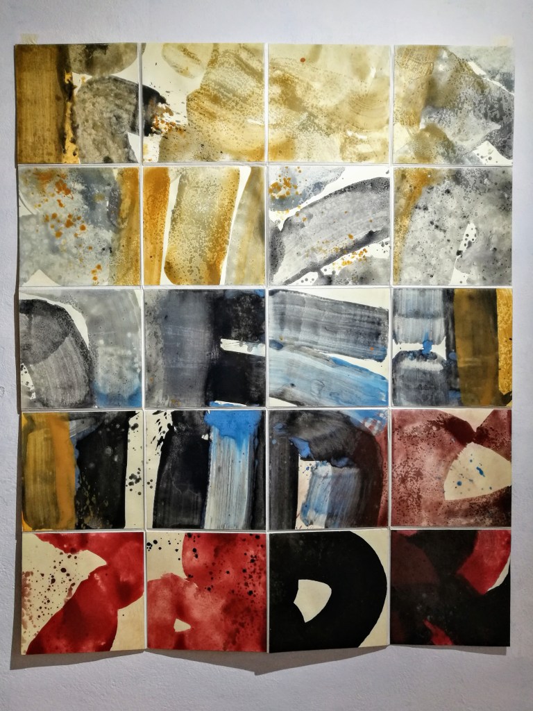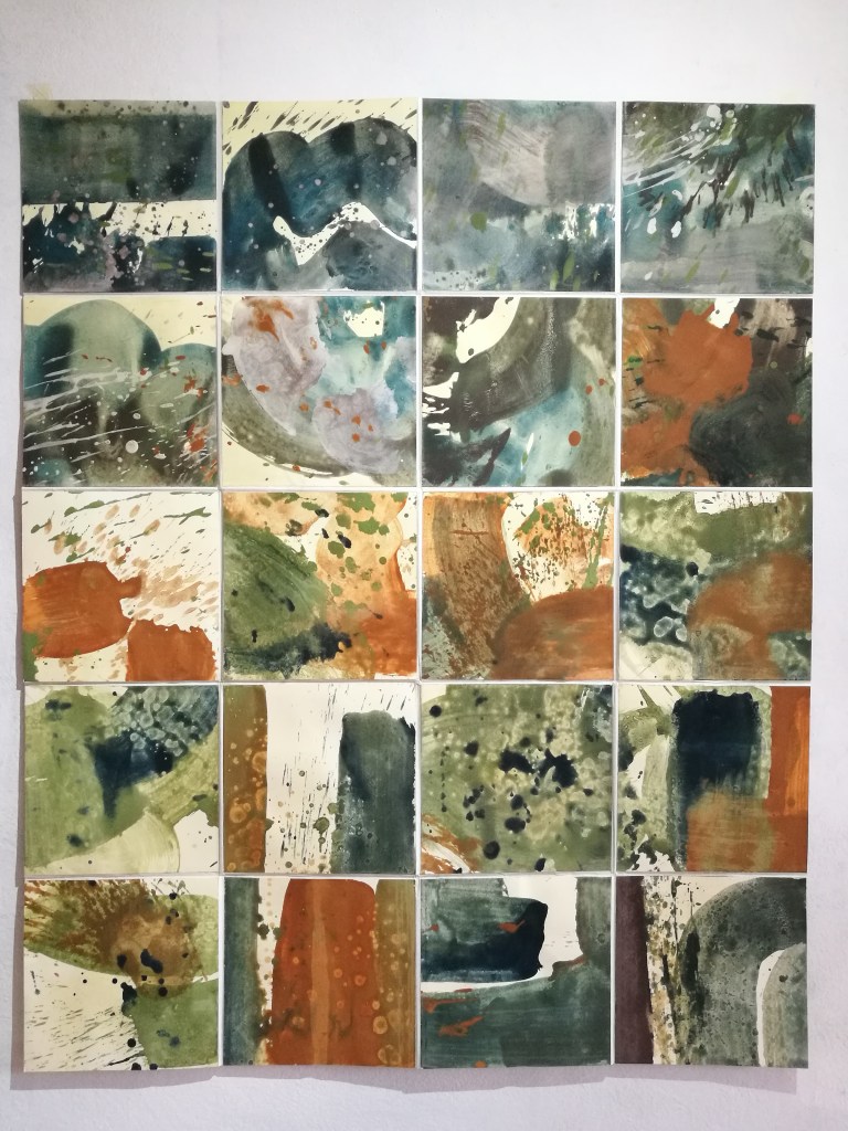 Hylè morphè. Série de 14 peintures. Pigment, liant & glacis sur papier Rives. polyptyque de 121x1204cm. 2021.