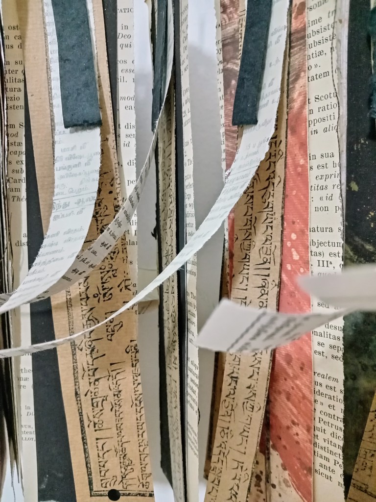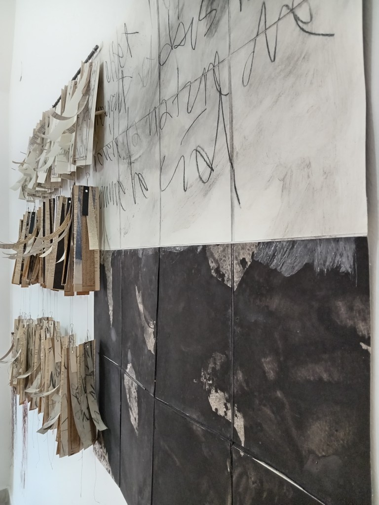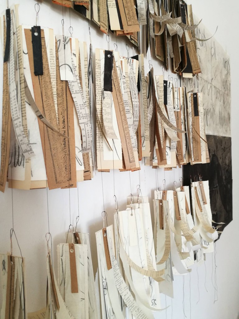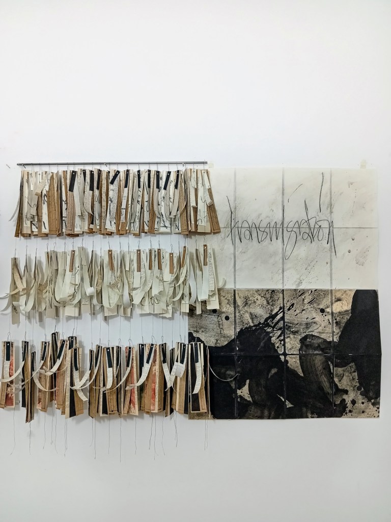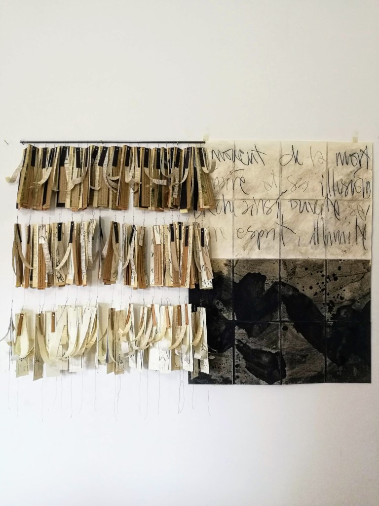 Metamorphosis/Bardo, est une série de 3 peintures/Ex-voto. Polyptyques 270x100cm. Pigment, liant, encre de Chine, marouflage papier de riz sur papier Rives. Écriture manuscrite, alphabet italique. 2024