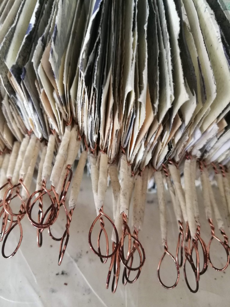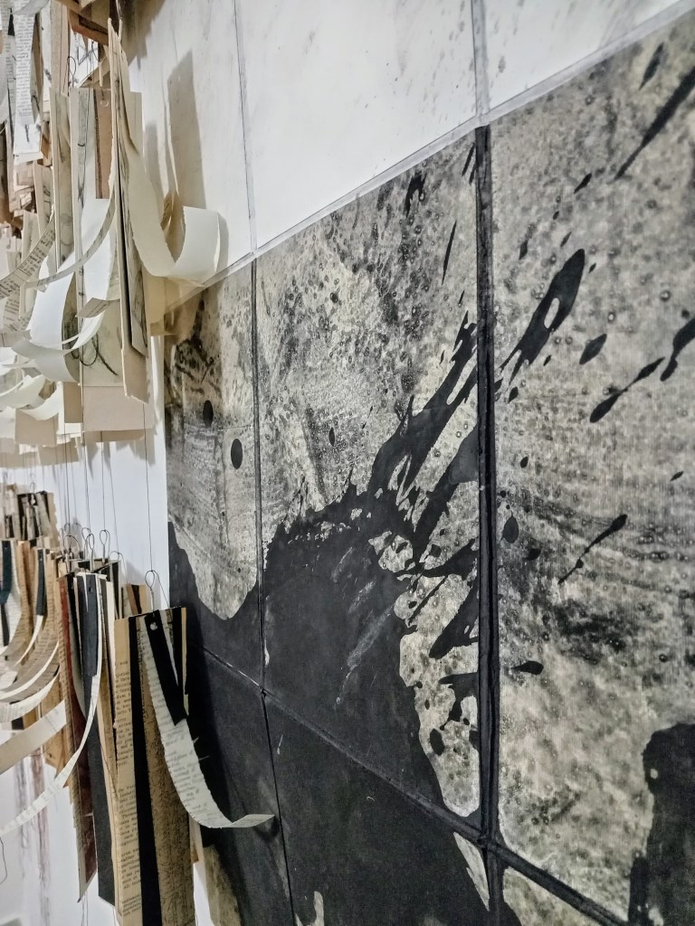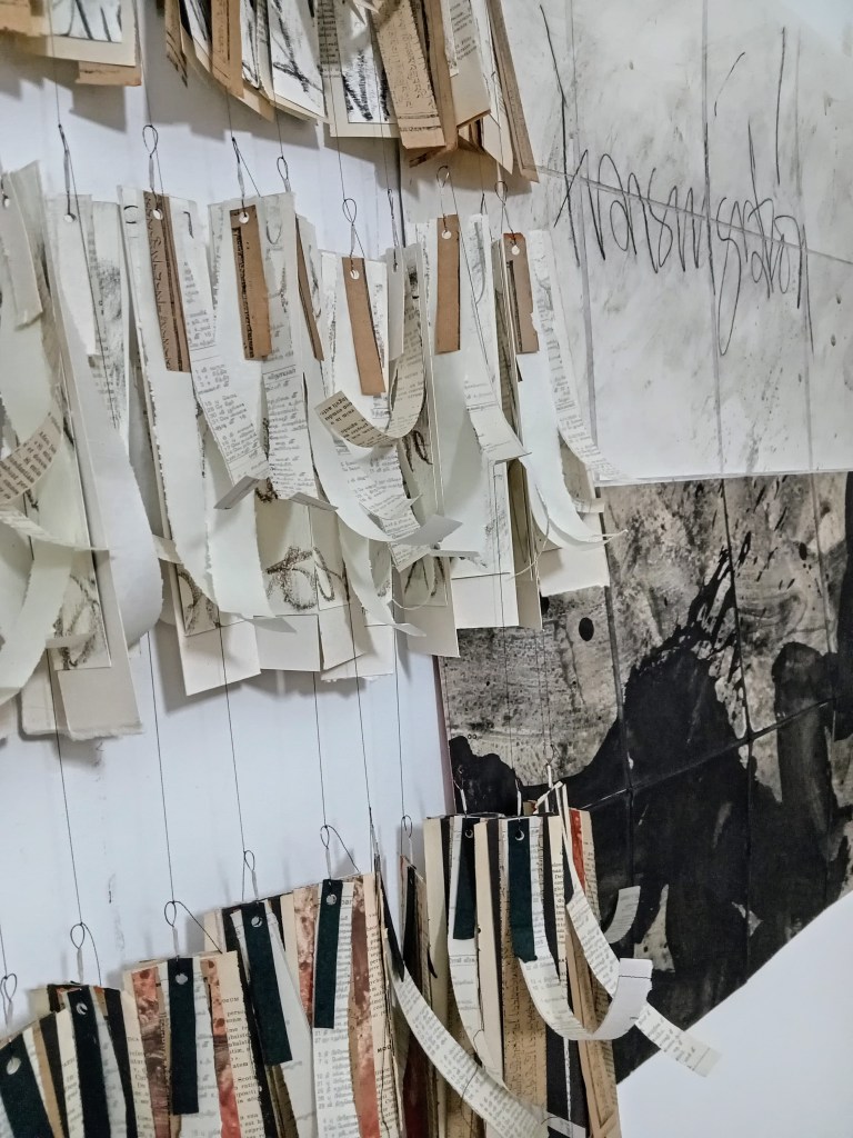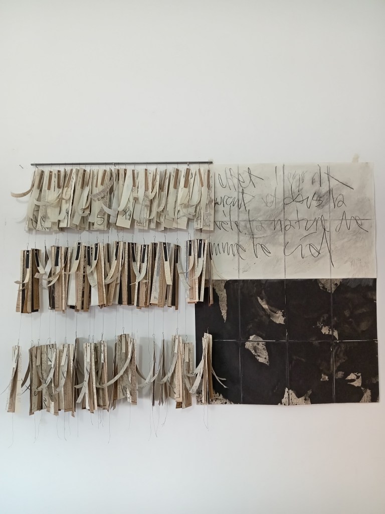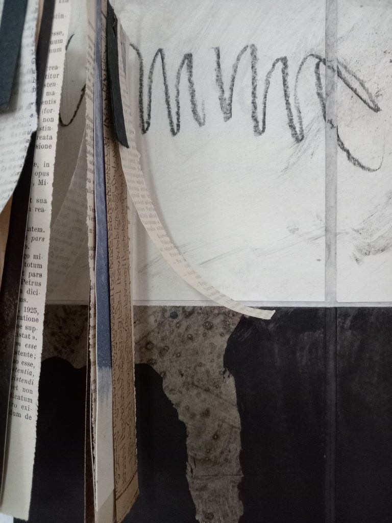 Metamorphosis/Bardo, est une série de 3 peintures/Ex-voto. Polyptyques 270x100cm. Pigment, liant, encre de Chine, marouflage papier de riz sur papier Rives. Écriture manuscrite, alphabet italique. 2024