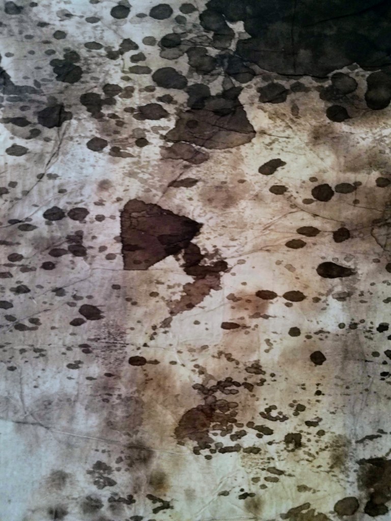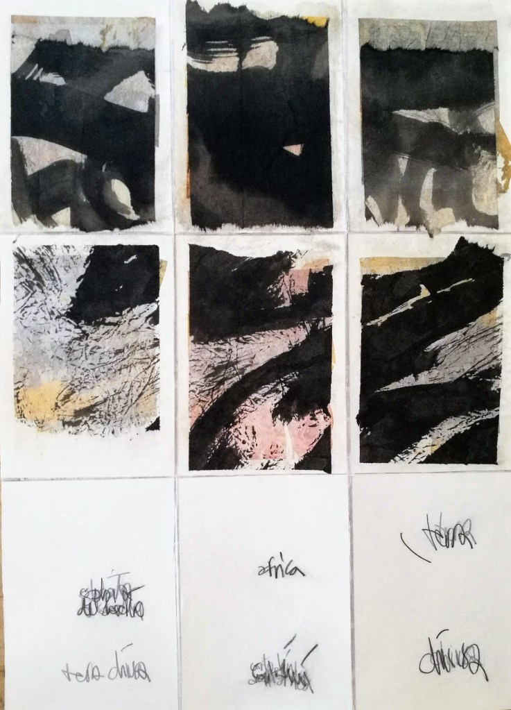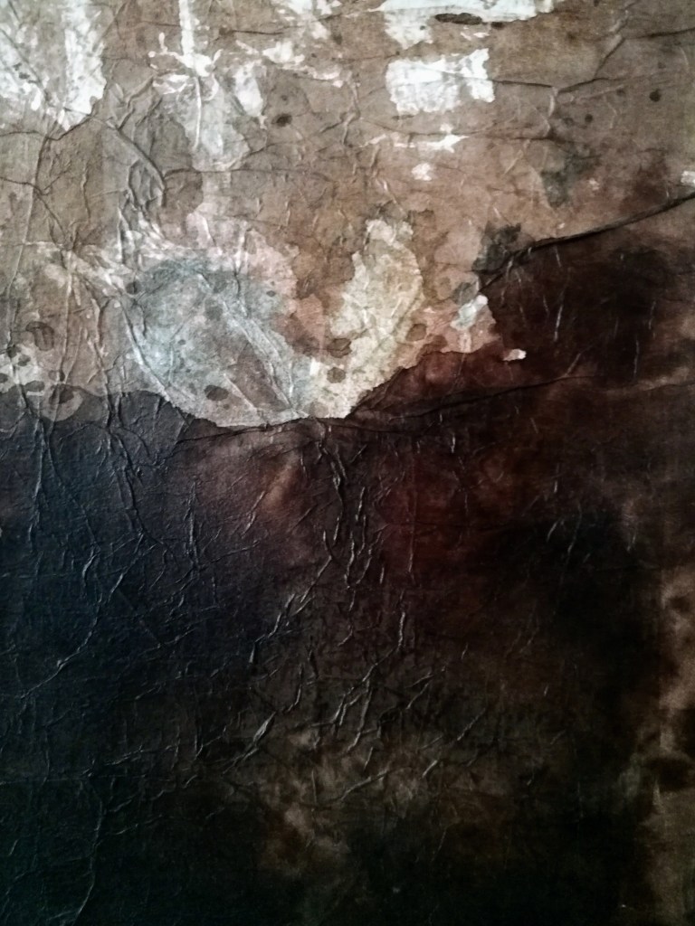 Une première étape tout de brou de noix, est une représentation d’un territoire, ces terres boursouflées en souffrance, quasi désertiques. Une palette monochrome de terre brulée.