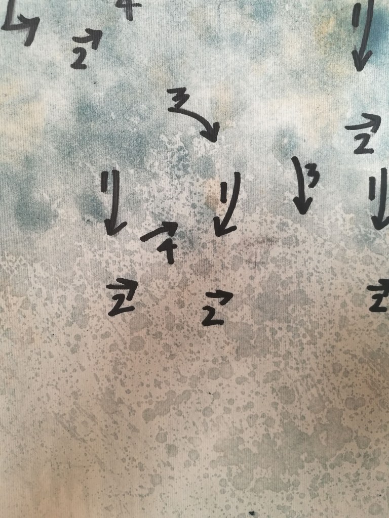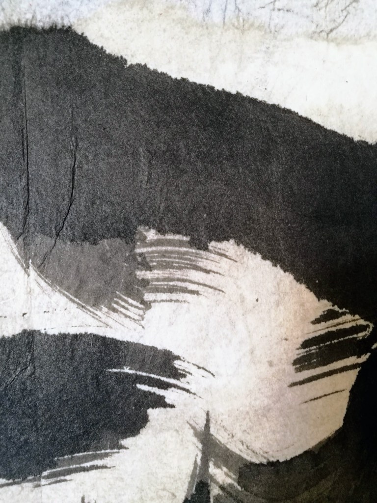 Une seconde étape tout en encre de chine, est une valse chaotique, d’agitation, de trépidation, d’effervescence, de la dynamique du pinceau avec une palette monochrome et un travail d’écriture. La trace d’un mot, d’une phrase, d’une ligne… Un jeu graphique qui passe par la prise de conscience du quand, comment et du pourquoi de l’exil. Une lutte humaine titanesque envers un déséquilibre, un dérèglement et qui suggère une planisphère dantesque.