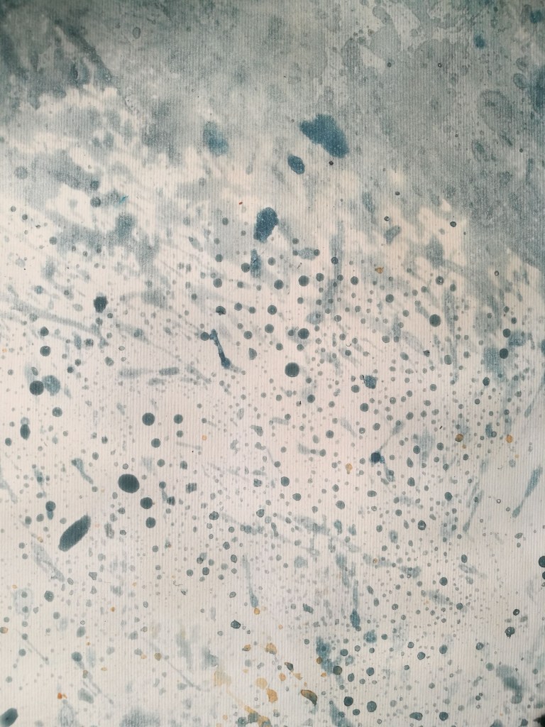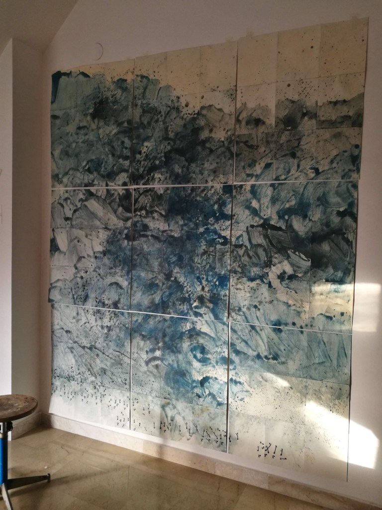 La troisième et dernière étape est tout de pigment avec une palette chromatique bleu. Un rapport à la matière, à la forme, à la texture pigmentaire. Sa monochromie, son impact esthétique, son jeu de transparences et de lumières symbolise la Méditerranée, l’horizon d’espérance. Car paradoxalement, la mer, ici, est une surface de repos oculaire. Elle est ambivalente. Une traversée de croyance, de conviction, de perspective pour qui est du bon côté du destin.