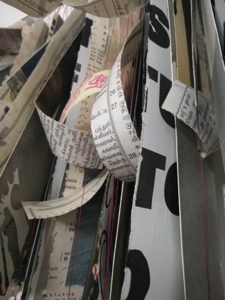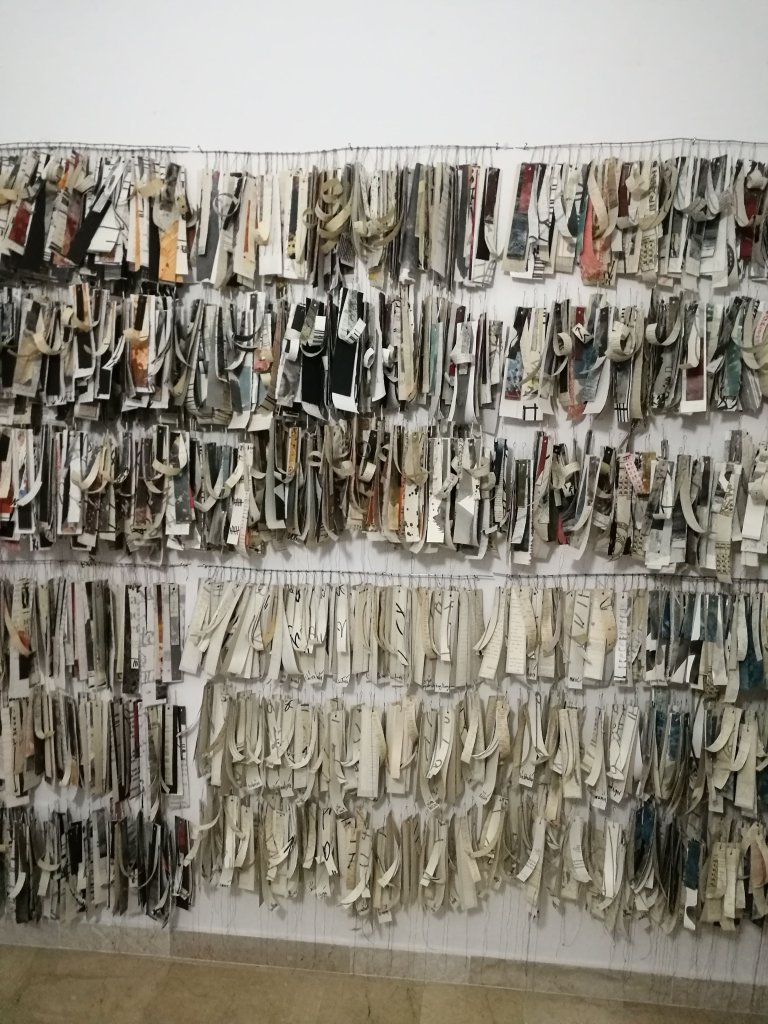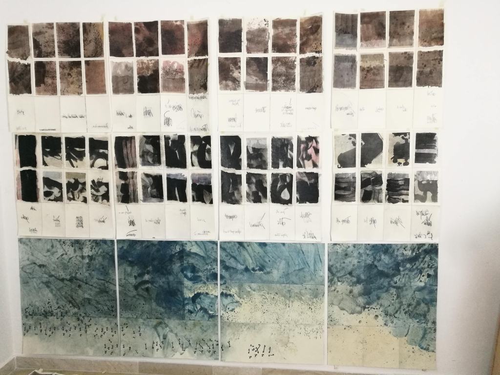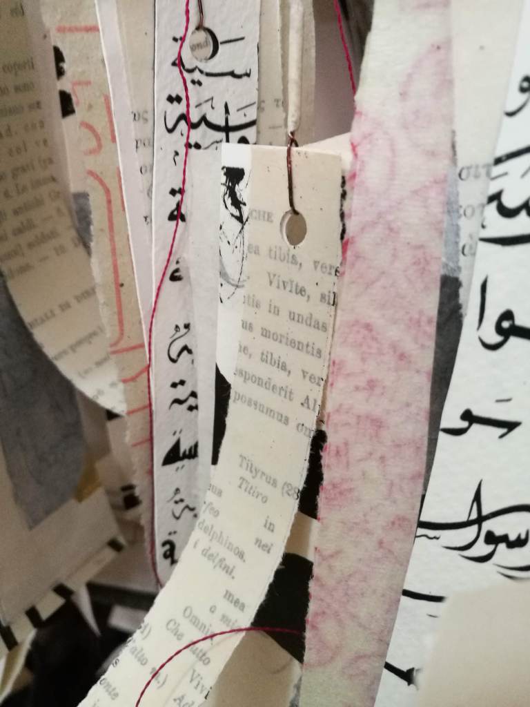 Orbis terrae, une série de peintures fatta a mano d’où surgit une réalité mise en écho avec une installation/suspension d’Ex-voto. Série de 6 suspensions au plafond de 420x95cm. Constitués de juxtaposition de peintures, de papiers anciens, d’écrits disparates, d’extraits de mots en diverse langues, Ces Ex-voto matérialisent la mémoire vivante des déplacés.