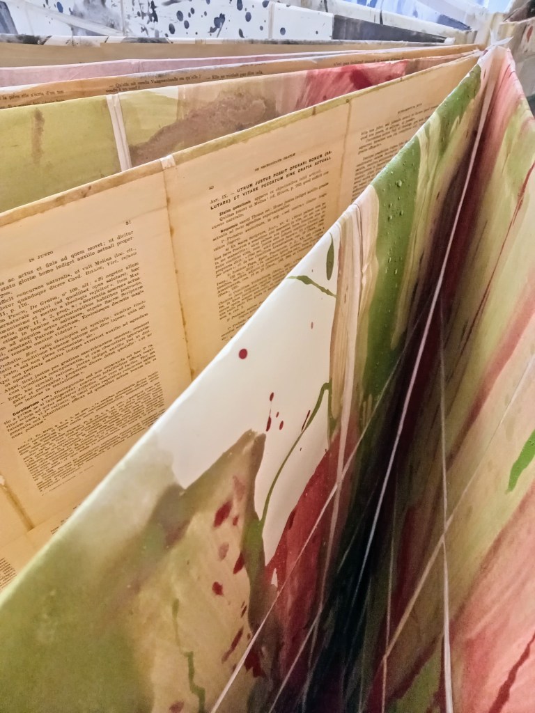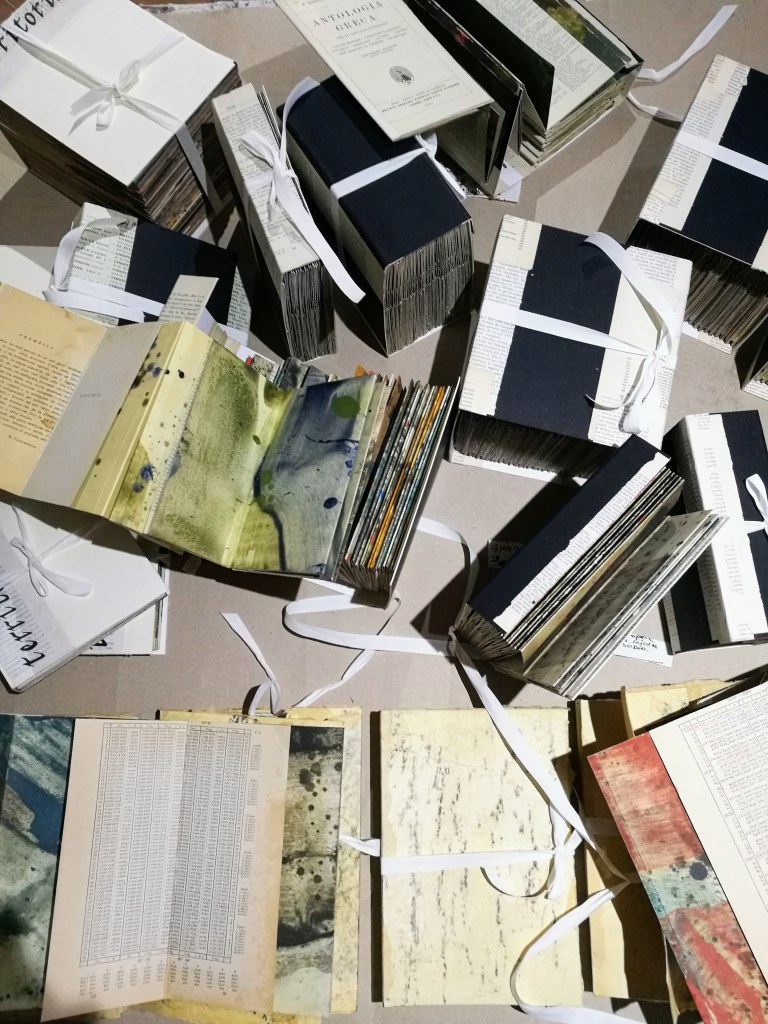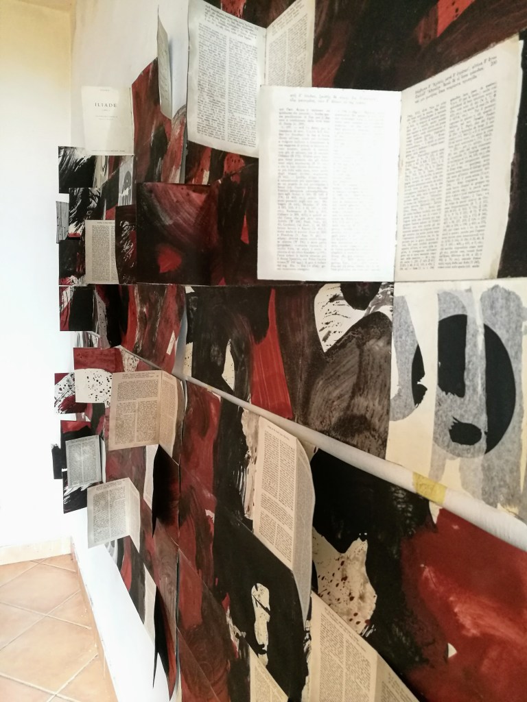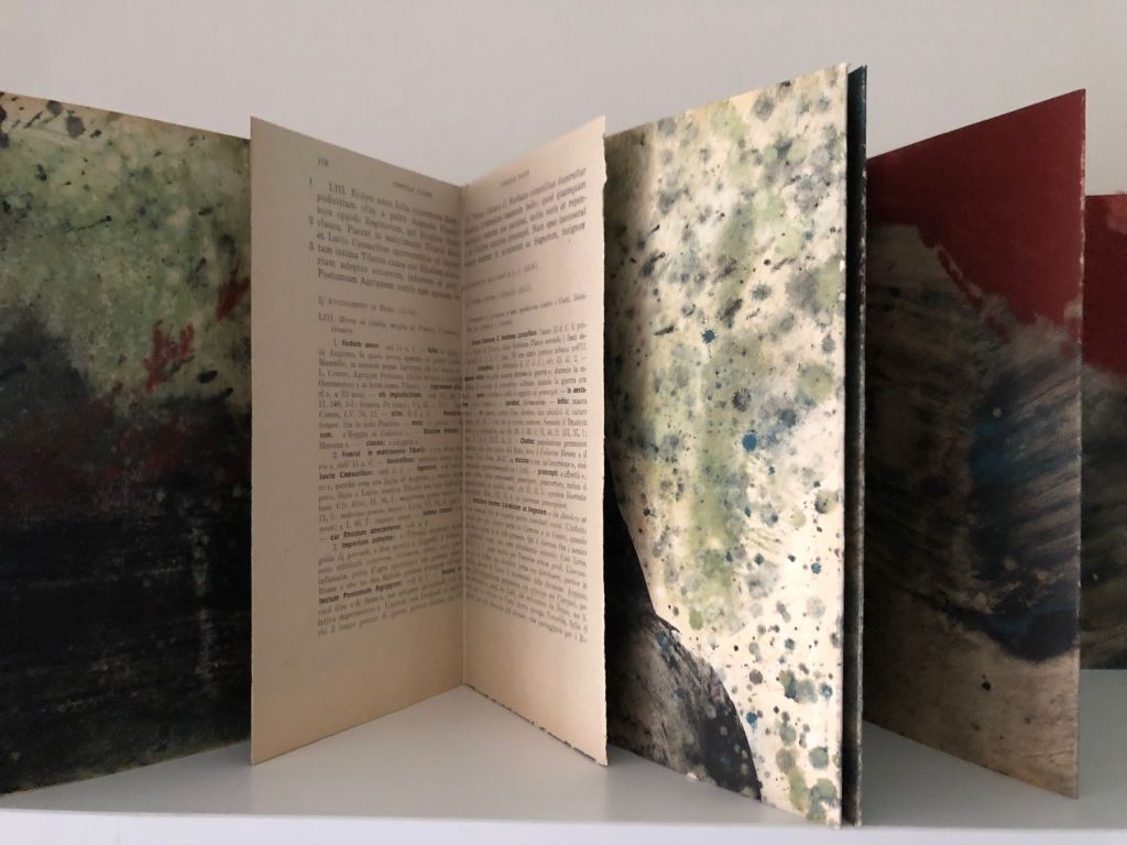 Territorium, le voyage intérieur est constitué d’une série de 10 livres d’artiste, des pièces uniques dont certaines font plus de 1400 cm de longueur. Pigment, liant et glacis sur papier Rives BFK. Au dos des peintures, marouflage des pages d’une série de livres anciens des années 50. Version bilingue italien, latin, grec. Des classiques de la littérature. Sophocle, Homère, Virgile, Aristophane, Dante…