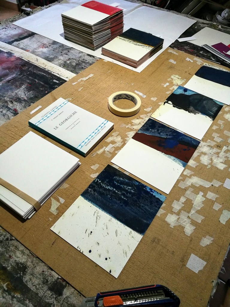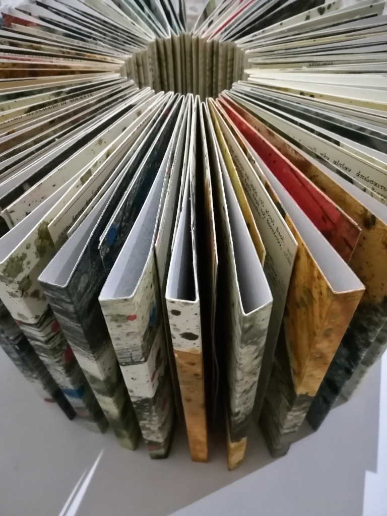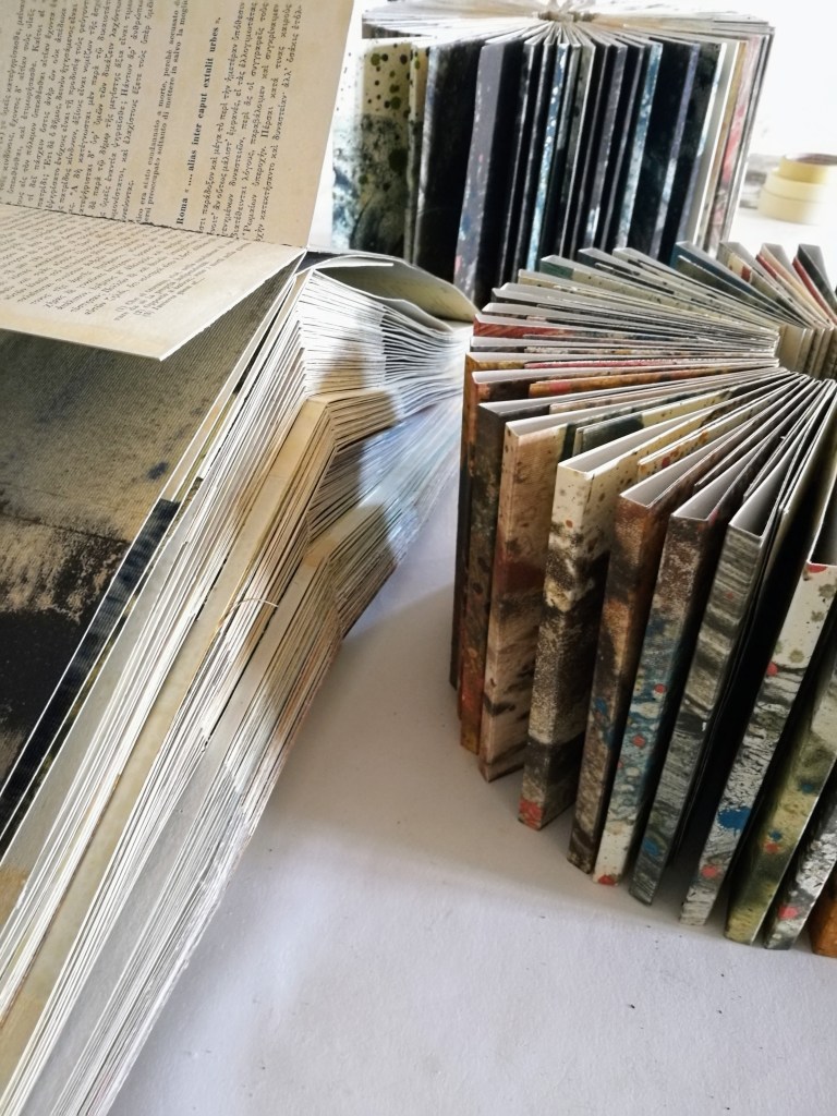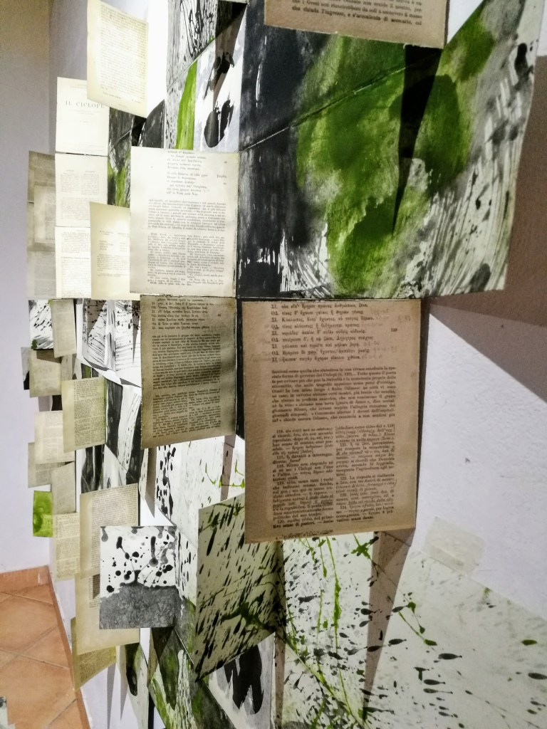 Territorium, le voyage intérieur est constitué d’une série de 10 livres d’artiste, des pièces uniques dont certaines font plus de 1400 cm de longueur. Pigment, liant et glacis sur papier Rives BFK. Au dos des peintures, marouflage des pages d’une série de livres anciens des années 50. Version bilingue italien, latin, grec. Des classiques de la littérature. Sophocle, Homère, Virgile, Aristophane, Dante…
