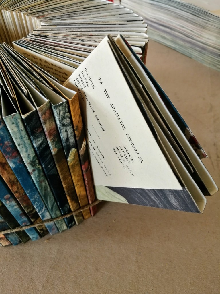 Pour accompagner ce début de lecture picturale, sont intégrées, au dos des peintures, les pages Les oiseaux et Les grenouilles d’Aristophane, poète grec. Gli uccelli, édition bilingue grec/italien, 1946. Le rane, édition bilingue grec/italien, 1948. Dans les deux récits, il est question de déplacement, de combat et d’adaptation pour un espace meilleur sur un territoire différent. Une critique satirique des utopies politiques et sociales.