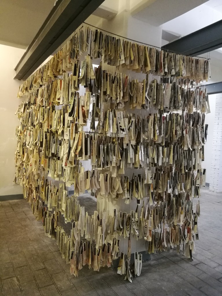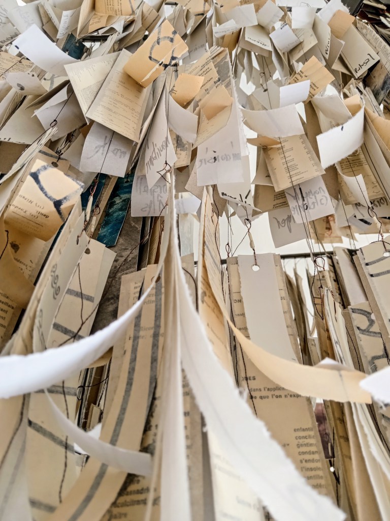 Un ensemble de fragments installés en suspension de 2m de hauteur. Bribes de discussions, de lectures, doutes et silences.