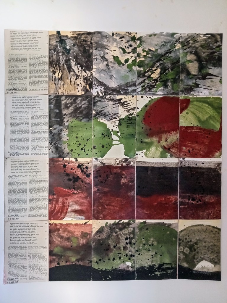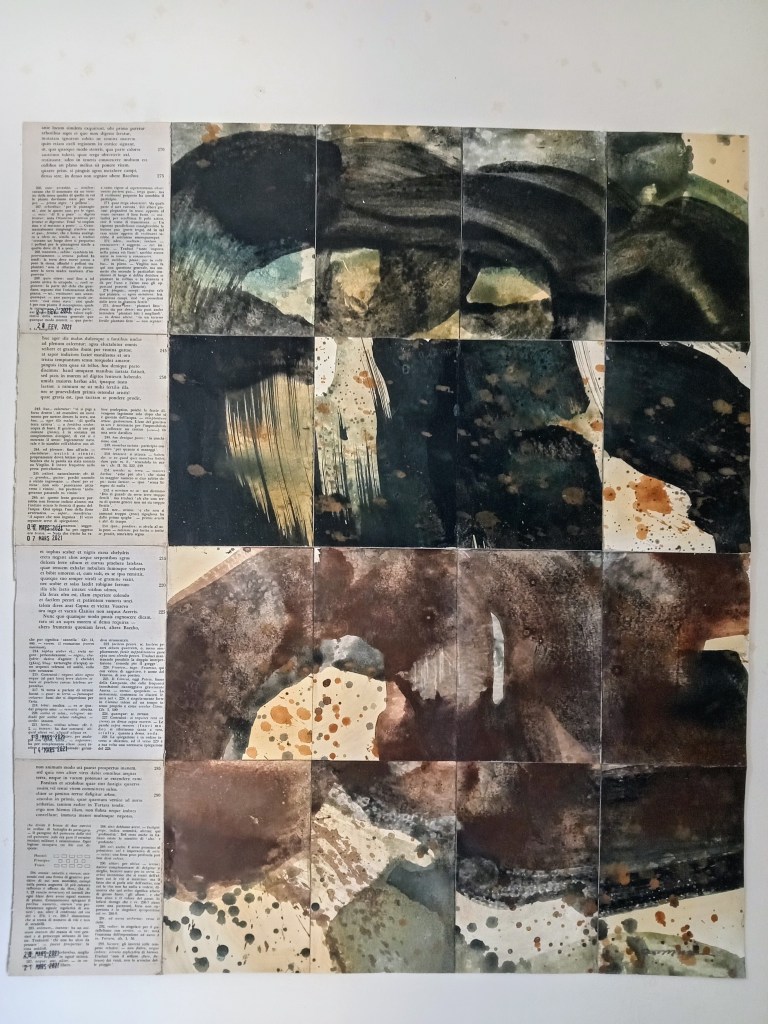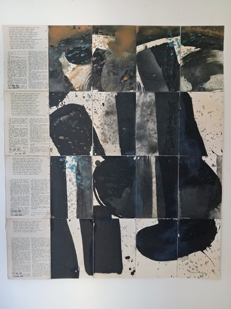 Territorium, d’un mal entendu à l’entendement est constitué d’un ensemble de 24 peintures/pages. La page/peinture est, au recto composée d’une peinture à base de pigment et au verso d’un encollage de suite de feuilles manuscrites d’éditions anciennes en diverses langues. 24 peintures inspirées des classiques et de récits plus contemporains, Giovanni Falcone, Roberto Saviano, Erri de Luca…