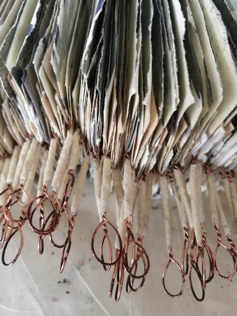 Cet édifice circulaire s’accompagne d’une marée de pensées votives, celles-ci sont des multiples séries d’assemblage d’extraits de peintures, d’écrits manuscrits sous forment de languettes de 22 x 4 cm.